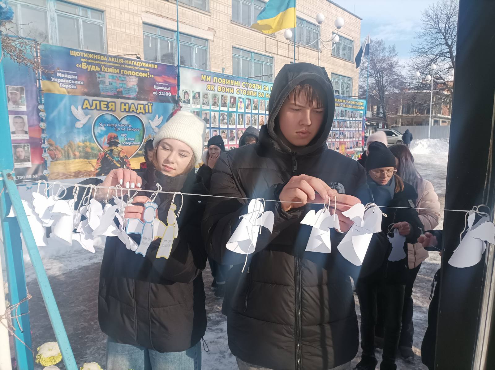 Учасники заходу поклали квіти на Алеї Слави, хвилиною мовчання вшанували подвиг Героїв та ще раз усвідомили: свобода — це не просто слово, це висока ціна, сплачена життям найкращих синів і дочок України. Особливо зворушливою стала участь у Всеукраїнській ініціативі Тиха акція «Ангели пам’яті» — учні власноруч виготовили та розвісили білих паперових ангелів як символ чистоти душ загиблих Героїв