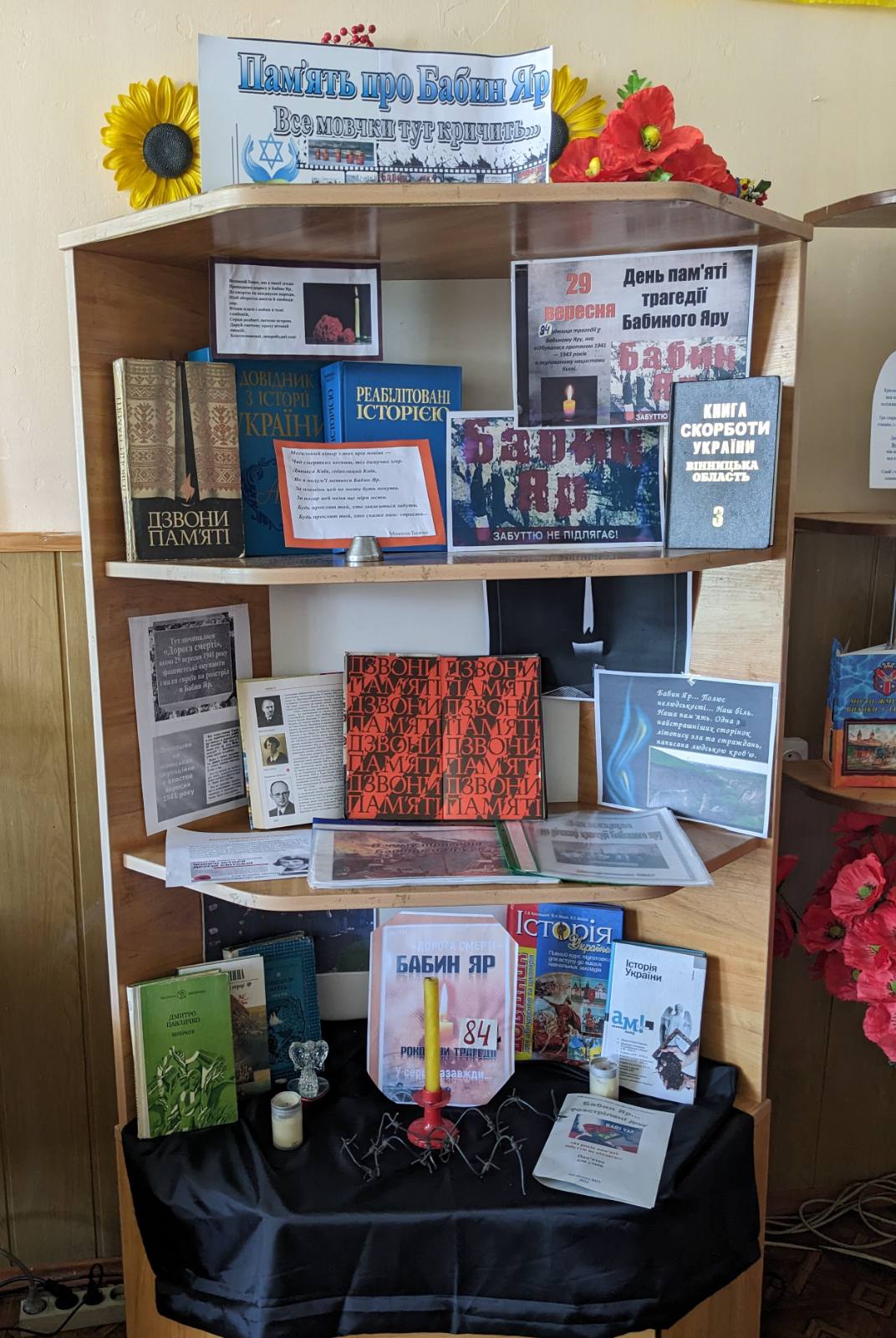 Організувала захід Бабич Л.С. в сценарії використані архівні матеріали, відеофільми, вірші, музичний супровід, метроном, монтаж за творами українських письменників. Спогади свідків цієї трагедії і моєї родини яка теж переховувала євреїв… Книжкову викладку організувала бібліотекар Вієцька Світлана «Пам’ять про Бабин Яр. Все мовчки тут кричить» і ознайомила з творами українських письменників які писали на цю тему. . Участь взяли учні групи №8 «Кухар , бармен, офіціант». Майстер виробничого навчання Білоконь С.А. та класний керівник Гулик І.О.