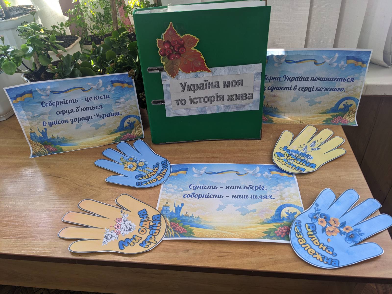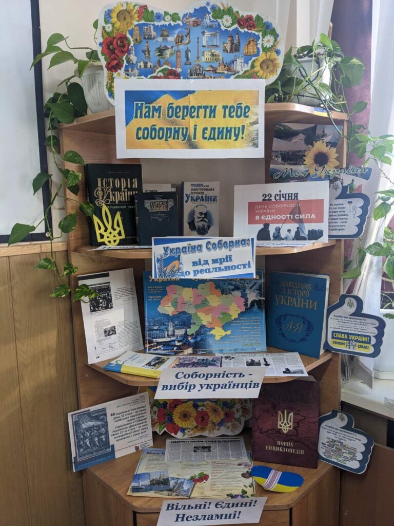 За допомогою літератури, яка представлена на виставці, працівники бібліотеки хочуть привернути увагу та поглибити знання молоді про історію виникнення свята Соборності України, виховувати патріотичні почуття та повагу до державної атрибутики, викликати інтерес до вивчення історії України.