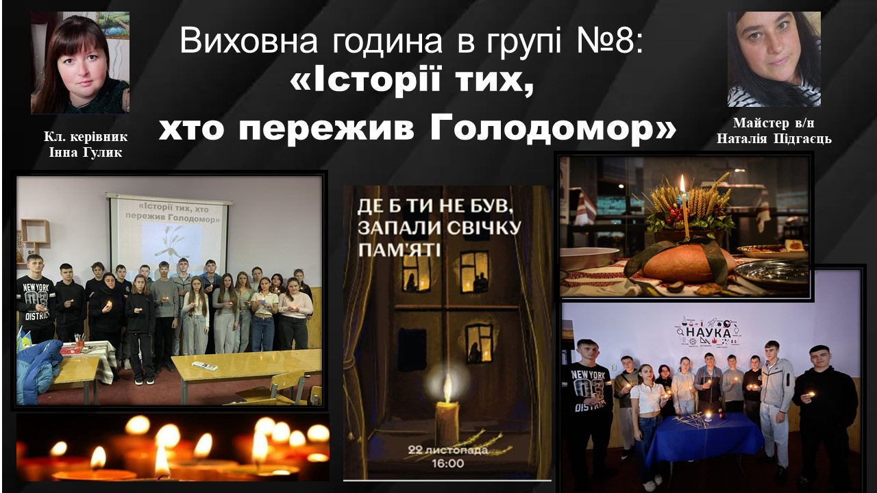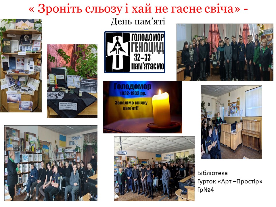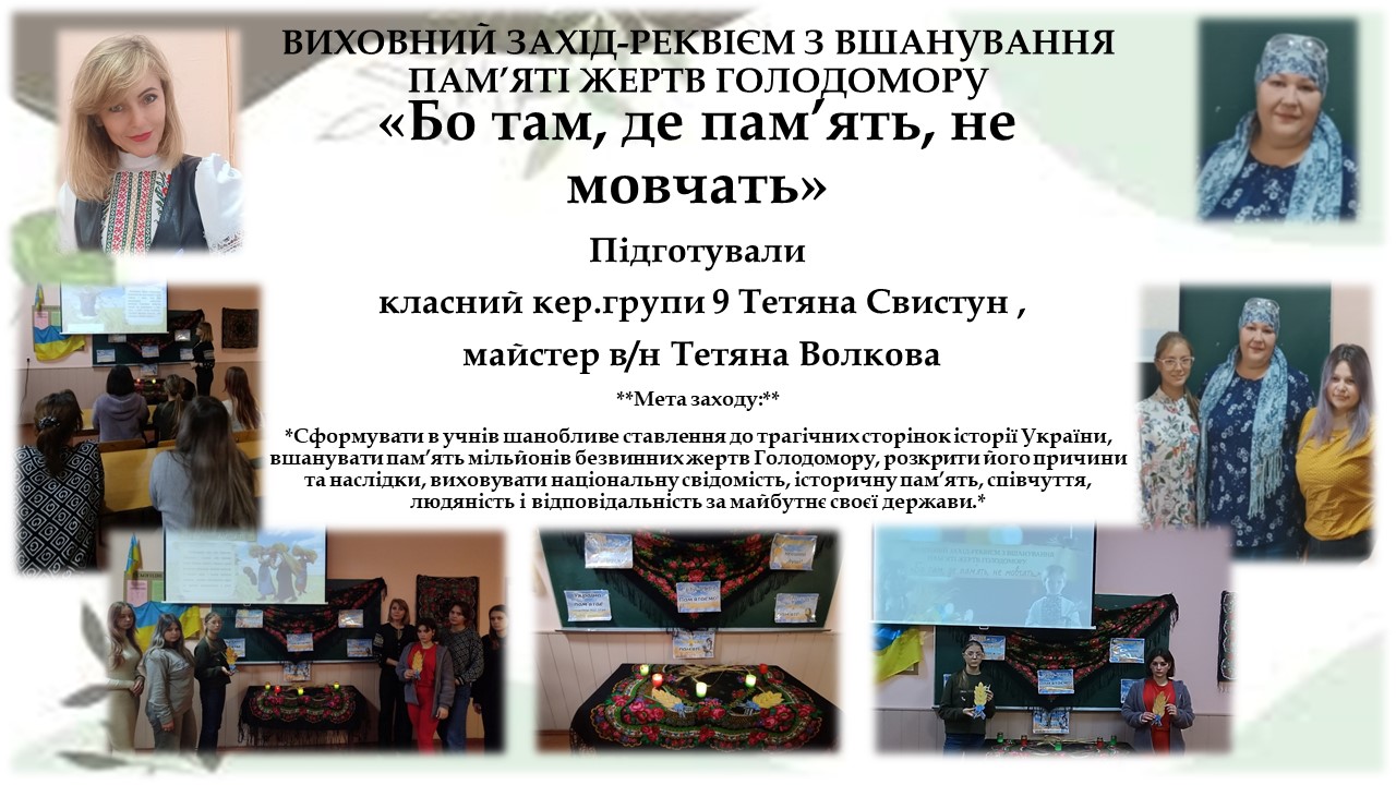 Учасники переглянули відеоролик, що відтворює трагізм тих подій, та стали свідками зворушливої постановки: дівчина ,учениця групи 6 Оксана Кошівська,під мелодію Мирослава Скорика пройшла через увесь зал як символ української дитини, чиє життя було обірване голодом. У її ж виконанні пролунав вірш “Ти кажеш, не було голодомору?”, після якого було запалено свічку пам’яті.