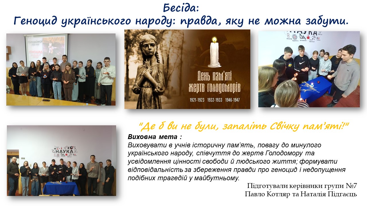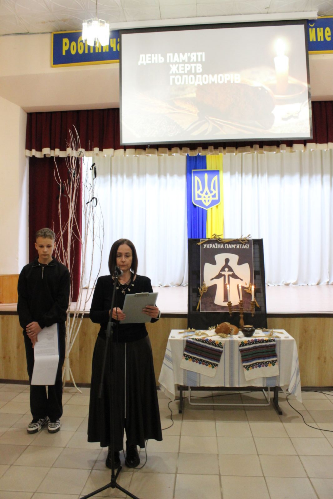 Заступник директора з навчально-виховної роботи Олена Чичкаленко наголосила на важливості збереження історичної правди та пам’яті про Голодомор — злочин проти українського народу, здійснений радянською владою.