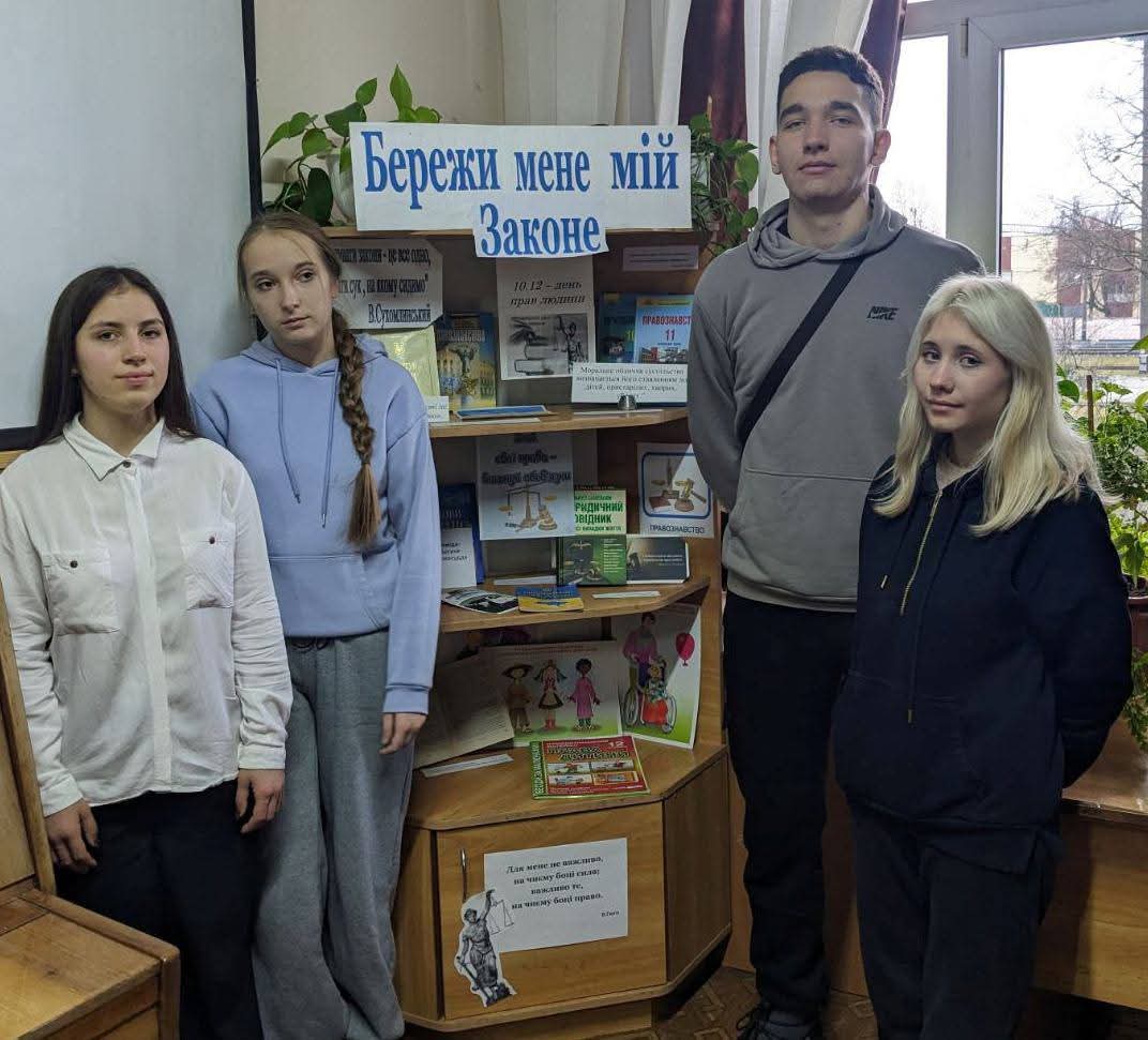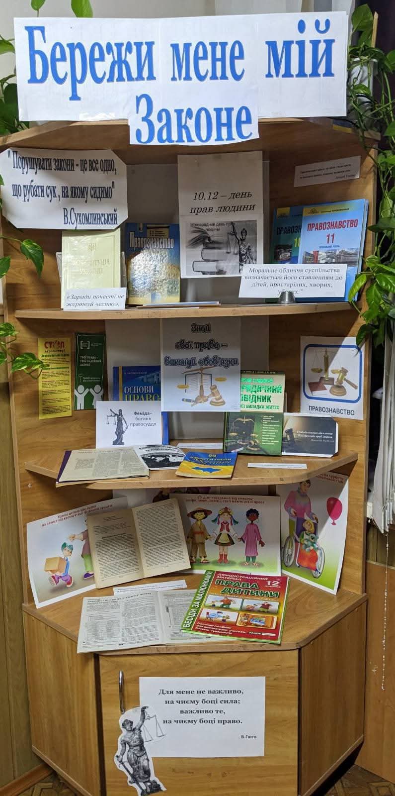 Бібліотекар Світлана Вієцька організувала книжкову тематичну виставку, де були представлені видання, що стосуються основ демократії, конституційно-правових механізмів забезпечення прав та свобод людини і громадянина в Україні, а також праці, де висвітлюються принципи дотримання прав людини у світовій практиці. Література цієї виставки стане в нагоді усім, хто займається самоосвітою, цікавиться питаннями правознавства.