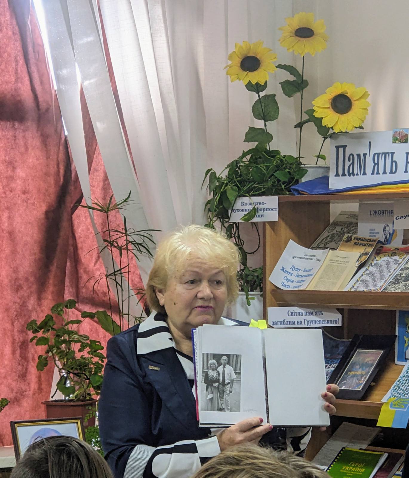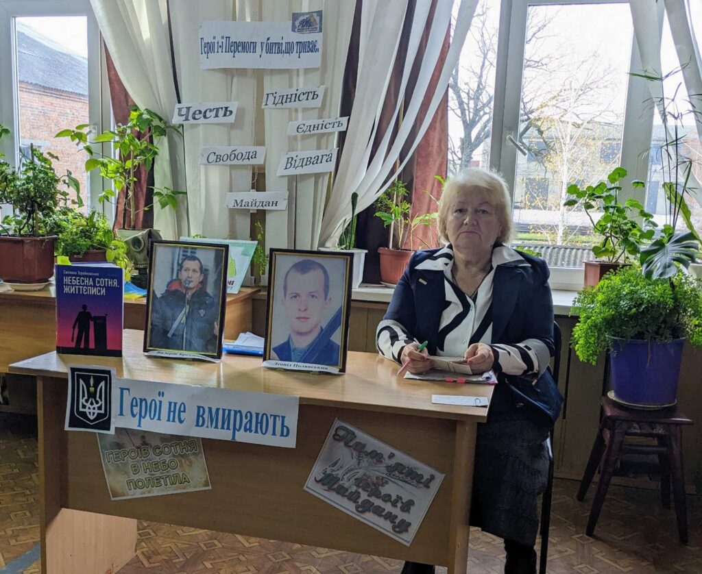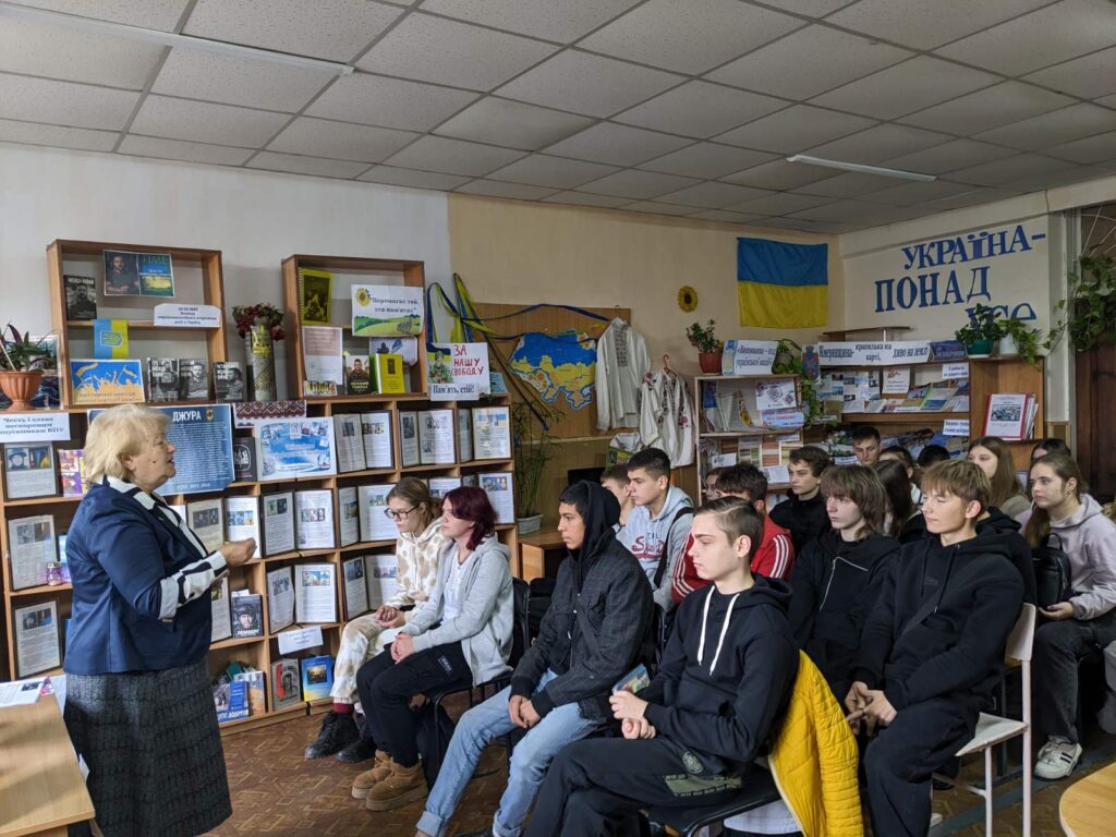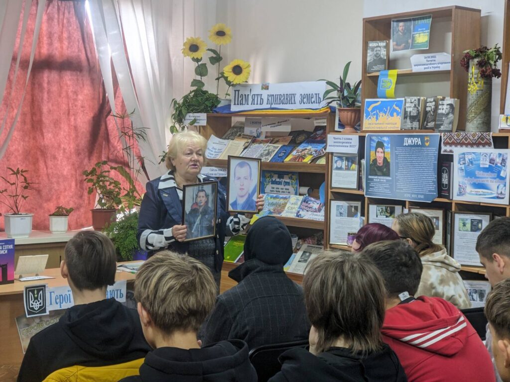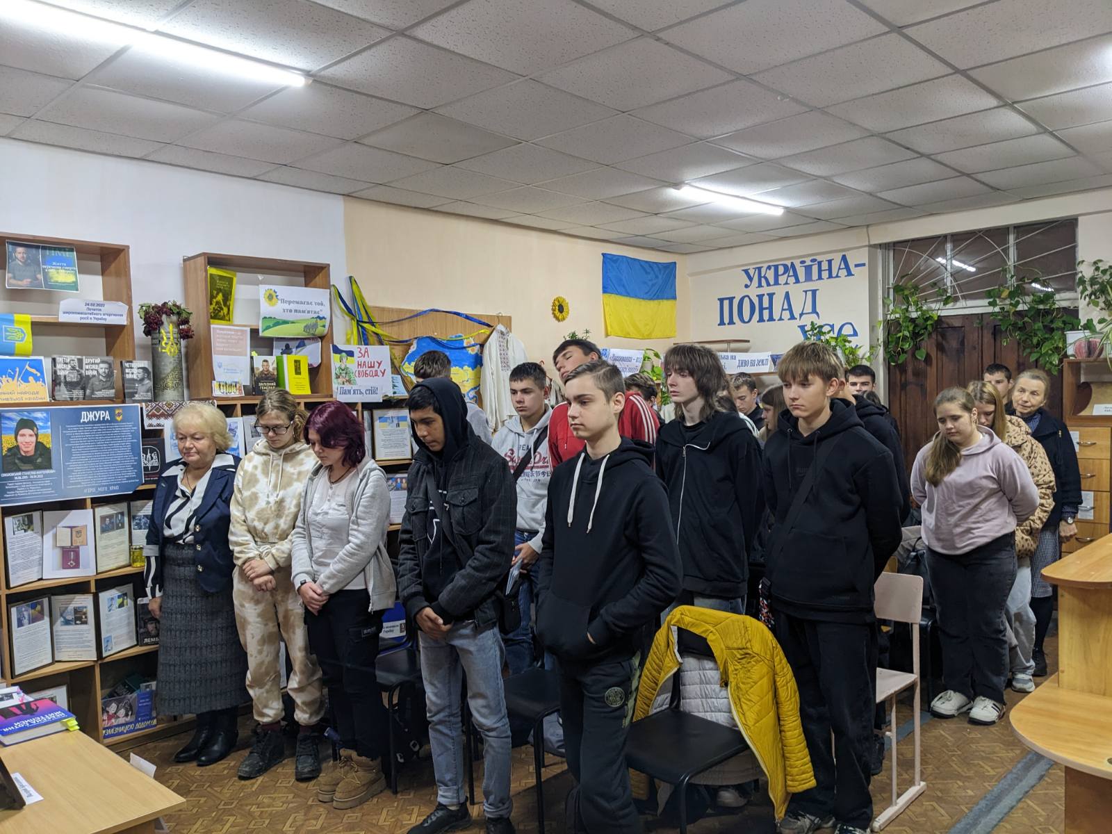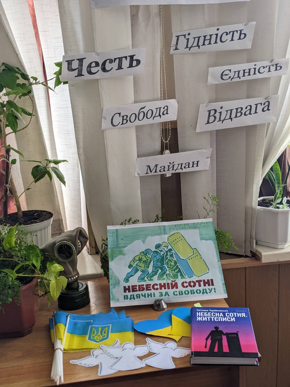 Емоційної глибини заходу додали відеоматеріали — «Хроніка подій Майдану», «Герої не вмирають», «Пливе кача…», підготовлені бібліотекарем Вієцькою С. Вони нагадали: народ, який пам’ятає своїх Героїв і береже свою історію, — непереможний.