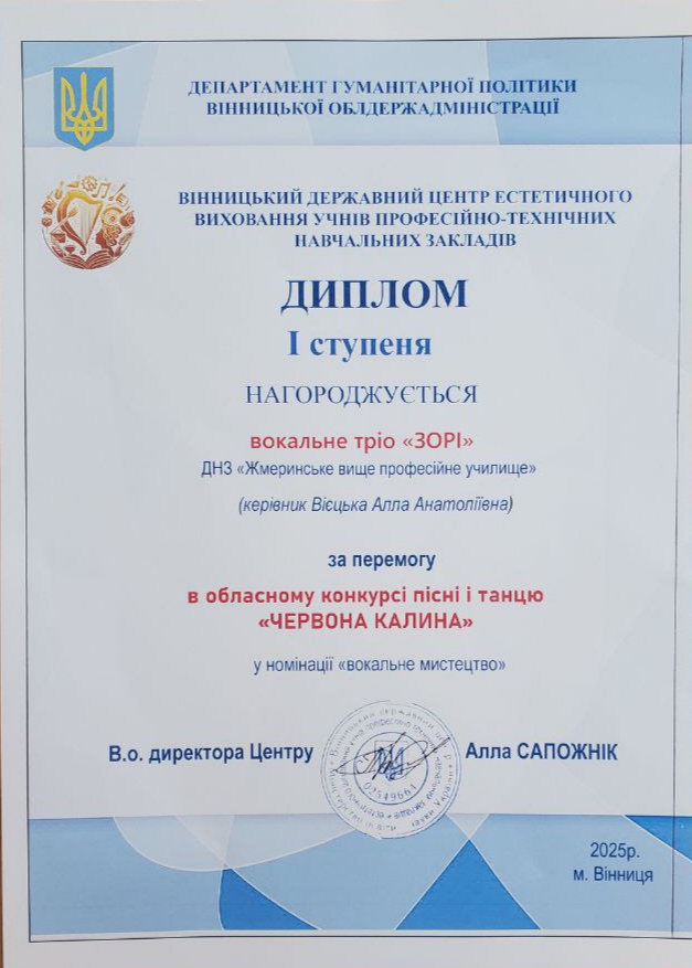 З радістю та гордістю повідомляємо про блискучу перемогу здобувачів освіти нашого навчального закладу у престижному обласному конкурсі пісні і танцю «ЧЕРВОНА КАЛИНА» для здобувачів освіти закладів професійної (професійно-технічної) освіти.